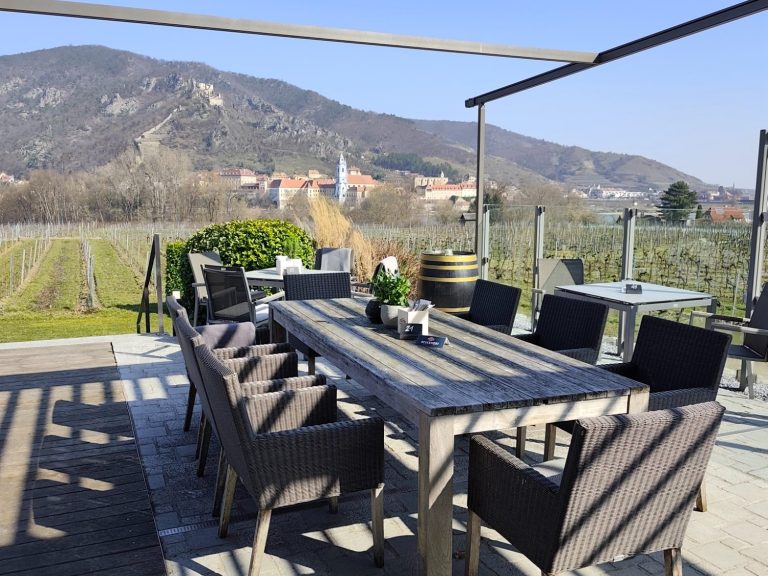 Genießen Sie Ihr Essen oder Glas Wein mit Panoramablick auf Donau und Dürnstein in entspannter Umgebung.